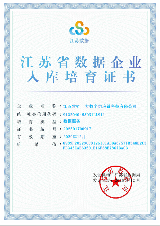 近日,江苏省数据局公布2025年度数据企业入库培育名单,江苏常链一方数字供应链科技有限公司凭借在数据服务领域的扎实实践与创新能力成功入选。